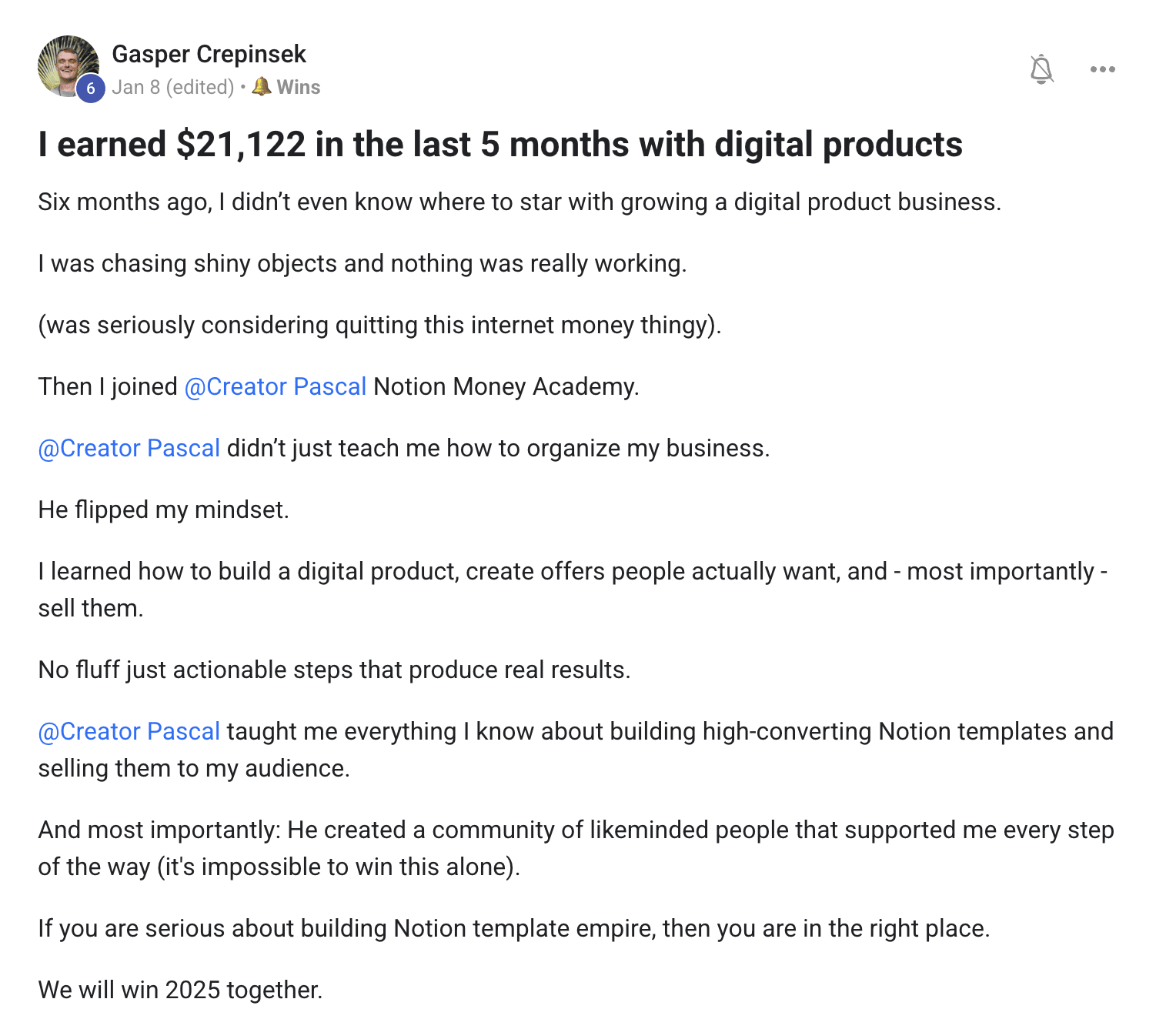 Hey Reader, Complete Beginners Are Winning (0 Experience)↓Hey Reader, Last year, a guy named Gasper DM'ed me on Twitter. "Hey, I’ve been following your emails for some time. This Notion thing sounds cool, but does it actually work?" I told him the same thing I tell everyone: "It only works if you take action, sir" Basic advice, but true advice. Naturally, Gasper was skeptical at first. But he still decided to hop in feet first. I advised him to create a template that could serve business customers (to maximize revenue) 🎯 1. He built a template for creating Customer Avatars. 🎯 2. He put it up for sale on Gumroad. 🎯 3. He launched it on Producthunt. Nothing crazy. No ads. No big audience. (in fact, he had less than 100 followers at the time of the launch) On launch day a few days later, he DM'ed me: "Dude. I just made my first sale." 🎉 $50 straight to his account. Then another. And another. By the end of the launch, he had made $500 from ONE template. And he’s not the only one… We have creators from all over the world making money with Notion templates. Mexico, Nigeria, China, Slovenia, Columbia, Germany, Philippines, you name it. Don't believe me? >> Check out these testimonials for yourself. Anyone, from anywhere in the world, can build a template today and launch it tomorrow. And the people who do that aren’t the best designers, the smartest marketers, or people with huge followings. They’re normal people who saw an opportunity and took action on it. I want you to be next, Reader. That's why I spent the last year perfecting the system I use to build and sell Notion templates. The exact system I leveraged to generate $275,000—without running ads, without a team, and without coding. The first iteration of this system (1.0) helped 500+ students go from generating their first ever online income, to having students like Gasper hitting $20k+ in a few months. But tomorrow? Notion Money Academy 2.0 starts its official launch campaign. Those who join before that will get all the new modules, new lessons, new opportunities and new ways to grow and earn faster than ever before. At a discounted rate. And once the official 2.0 launch ends, the price will be fixed at $497. But... There's still 1 day left to grab your early-bird discount. If you enroll within the next 24 hours, you can join for a one-time payment of The question is: Will you be the one selling templates—or just watching others do it successfully? This will be the last email I send about this early bird discount. 24 hours from now and it disappears for good. In the email you'll receive tomorrow, I'll outline exactly what 2.0 means for you and your earning potential. You'll learn everything from picking your niche, to generating infinite template ideas, to step by step building tutorials. Or you can take the fast track and get everything right now at $200 off Whatever suits you, Reader. Until then, - Pascio (aka. Creator Pascal) P.S. Remember Gasper, the dude who made $500 on his first launch? After that launch, he saw the potential of Notion templates and went ALL IN. Just a few months later, he posted this in our community after hitting $21,000 in revenue: |